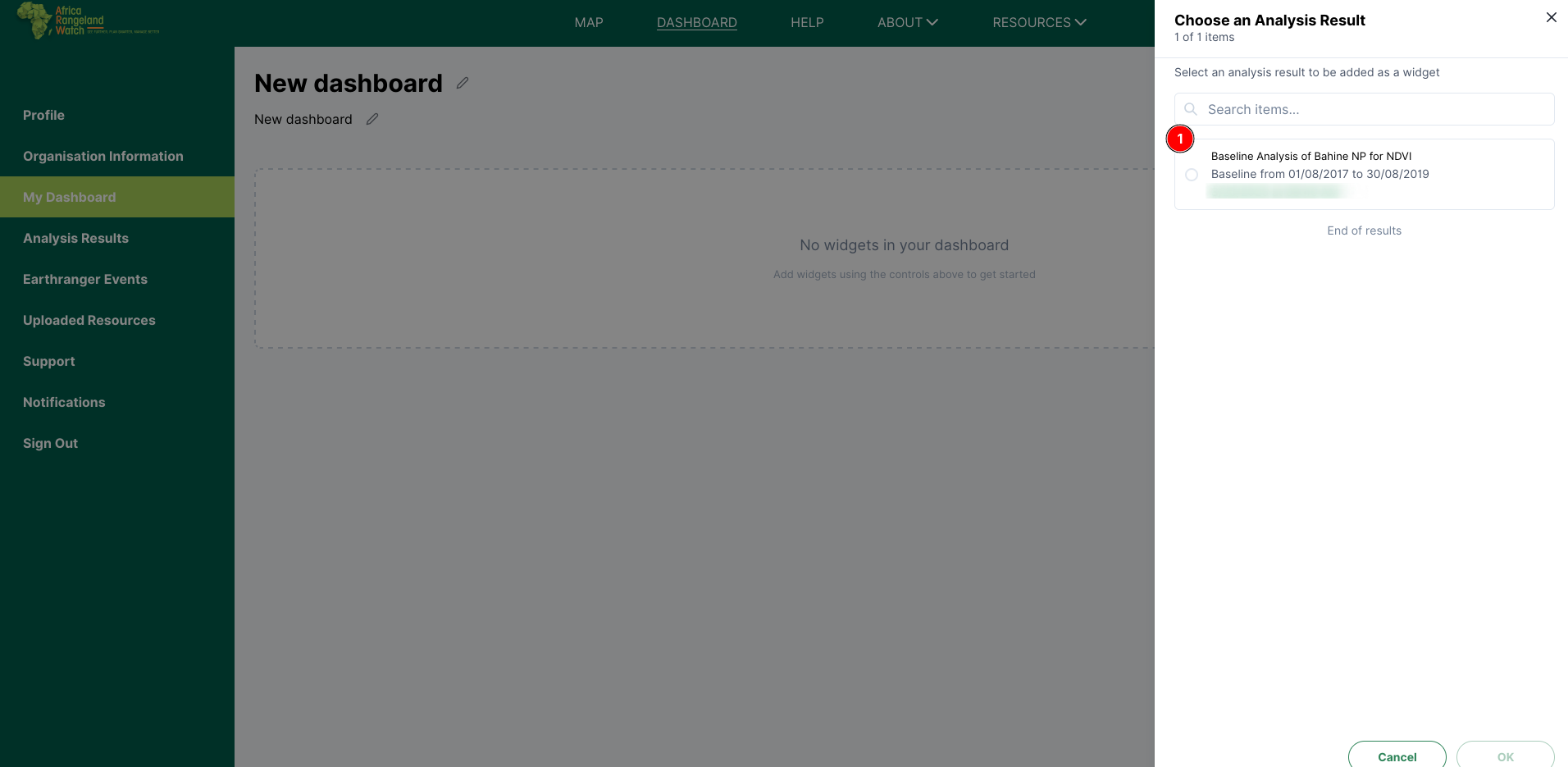 Use Add Widget → From Analysis Result to insert the analysis as a widget (and add more if needed).