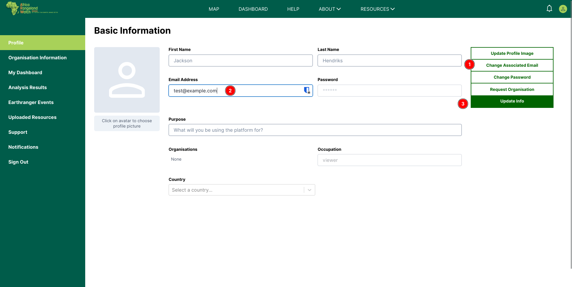 Profile: Click on this tab to view the user profile on the Africa RangeLand Watch (ARW).