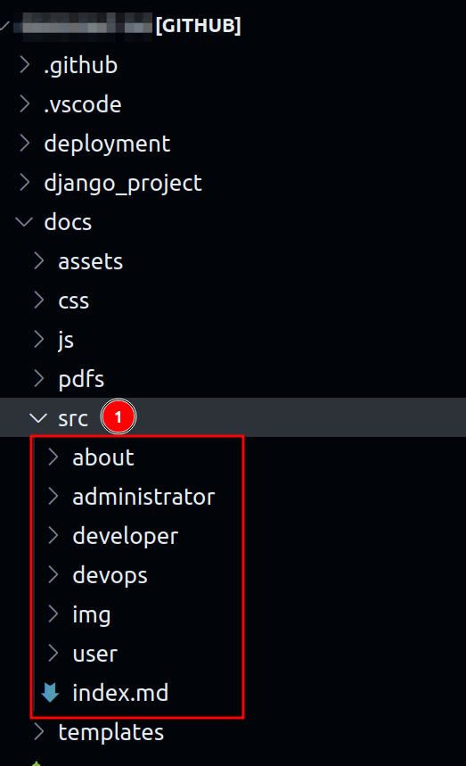 Once you have expanded the docs directory, 1️⃣ click on the src directory. All sub-directories within the src directory contain the files that become the documentation. Each sub-directory contains an index.md file that is required for the building of the documentation and static site. If you add a new sub-directory into any folder it must also contain a populated index.md file.