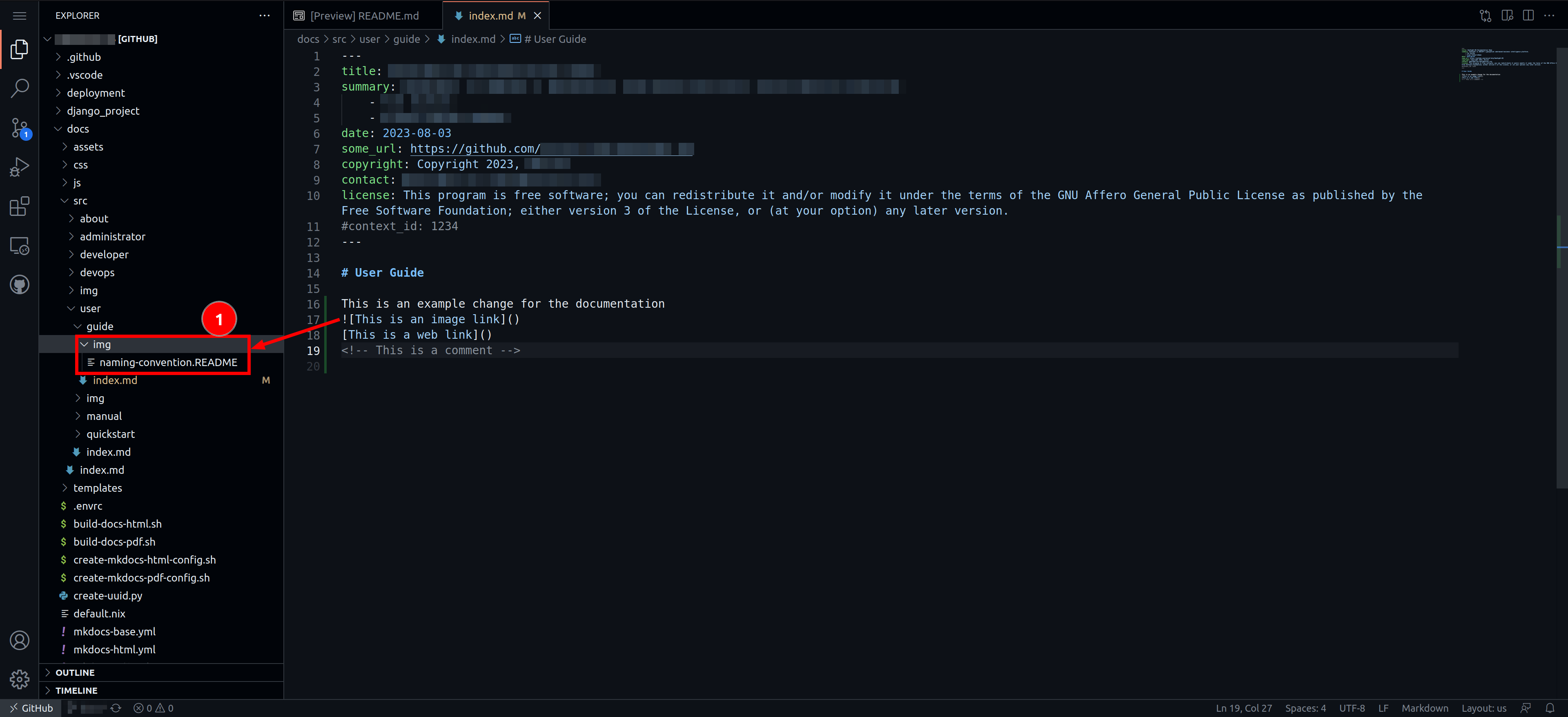 Once you have the file open, you can start adding to the documentation using Markdown syntax. If you need to add images to your documentation, add them to the relative img sub-directories following the naming conventions set out in the naming-convention.README within the img folders.
